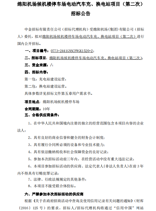 綿陽機(jī)場(chǎng)候機(jī)樓停車場(chǎng)電動(dòng)汽車充、換電站項(xiàng)目(第二次)招標(biāo)公告