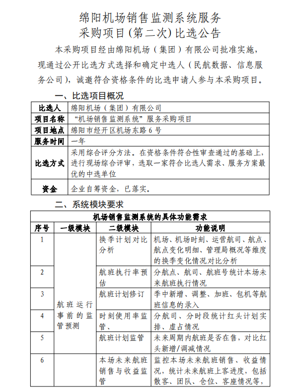 綿陽(yáng)機(jī)場(chǎng)銷售監(jiān)測(cè)系統(tǒng)服務(wù)采購(gòu)項(xiàng)目(第二次)比選公告